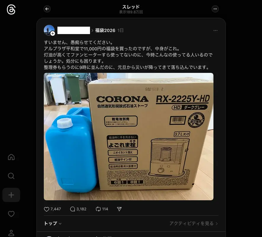 既にまあまあ叩かれてるようだし、防災云々は個人の危機意識次第だから指摘としてはちょっと違う気もするけど。それに、福袋なんてユルいギャンブルみたいなもんでハズレと感じる事自体はひとそれぞれで良しも悪しも無いんだけどね。自分の引きなのに店名まであげるのはやり過ぎだし「今どきこんなの使っている人」と他人を貶めるのはちょっと言い過ぎ。私が同系の機種(2222Y)を使っているからそう思うのかもだけども。