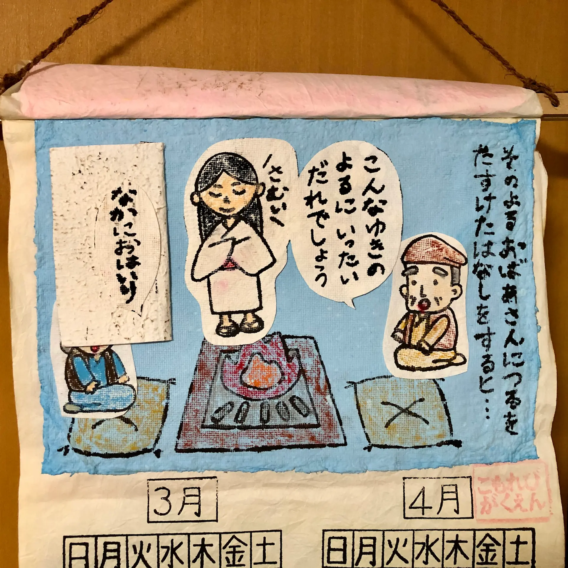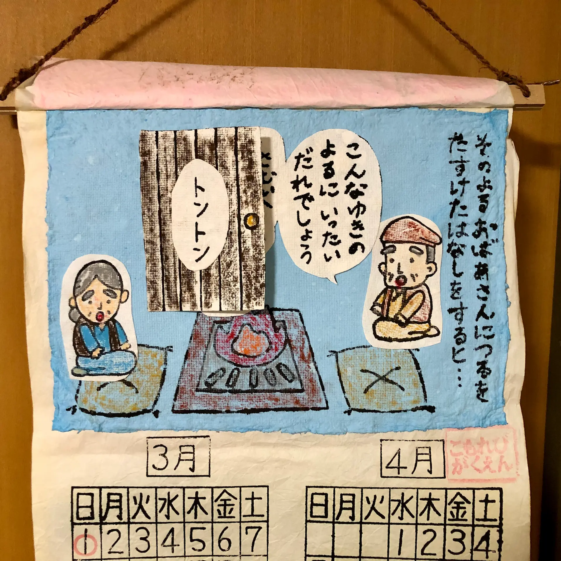 旅行代理店からもらった手作りカレンダーもめくった。昔話「つるのおんがえし」の2枚目だ。扉をめくると \ サムイ / って可愛いかよ。