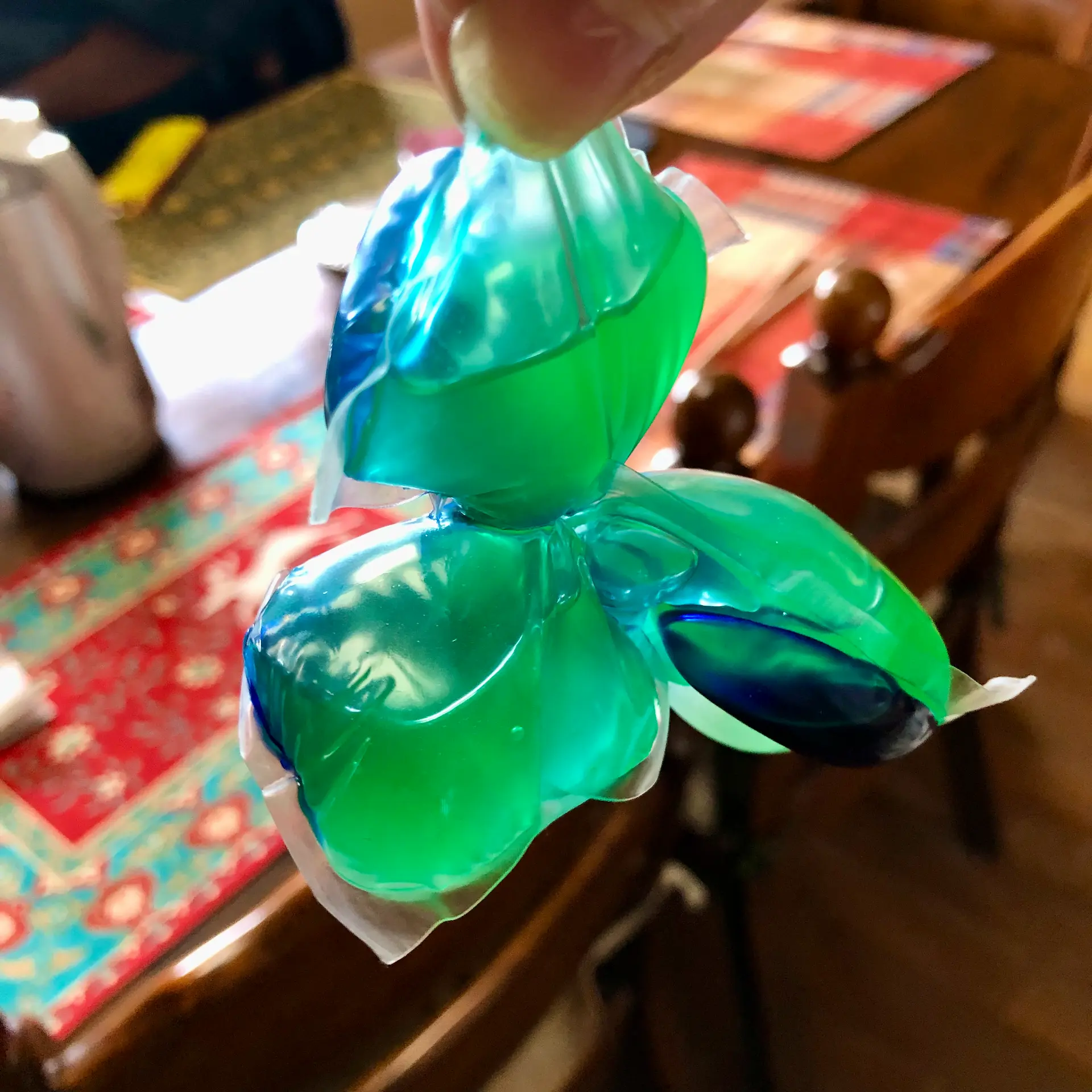 母が使っているアリエールジェルボール、洗濯代行をする際につまみあげたらくっついていた...おおう。湿気のせいかな? 破れなくてよかったぁ。 お徳用の詰め替え袋をそのまま使っているけど、本来は何かケースに入れるとかするものじゃないのかな? 詰め替えの袋のチャックを綴じればいいのだろうけど、それすらしていなかったし。