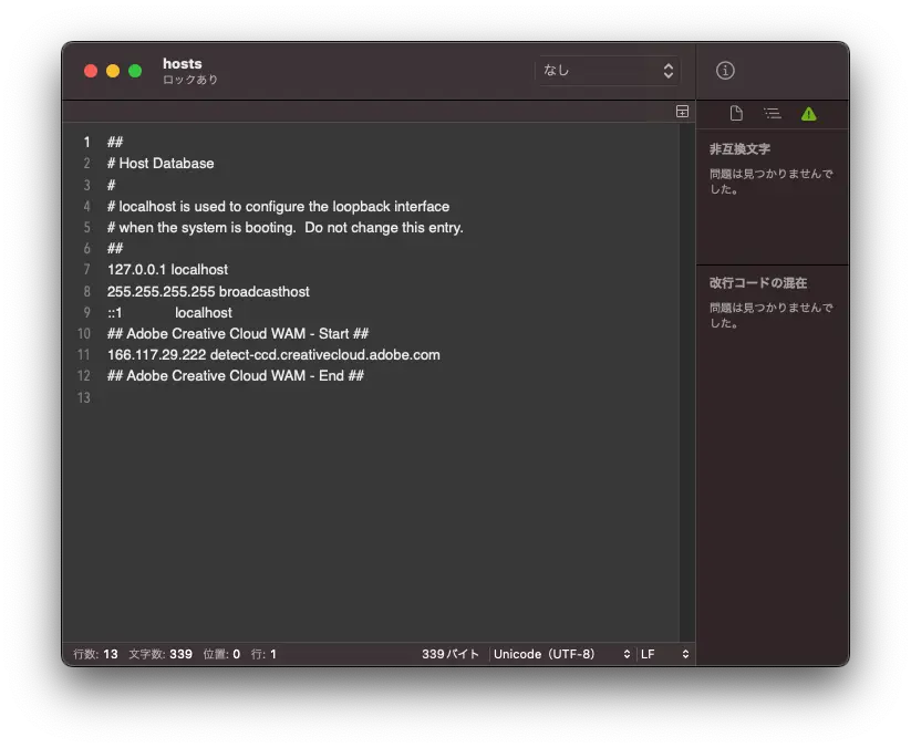 うん、AdobeはEvilに闇落ちしてる。さすがにこれはCreative Cloud appをmalware認定されても文句を言えないよ。コメントアウトしようかとも思ったけど、Time Stampが違うのがなんか嫌でTime Capsuleで以前のを復旧させちゃった。これで書き換えられても判りやすいぞ。